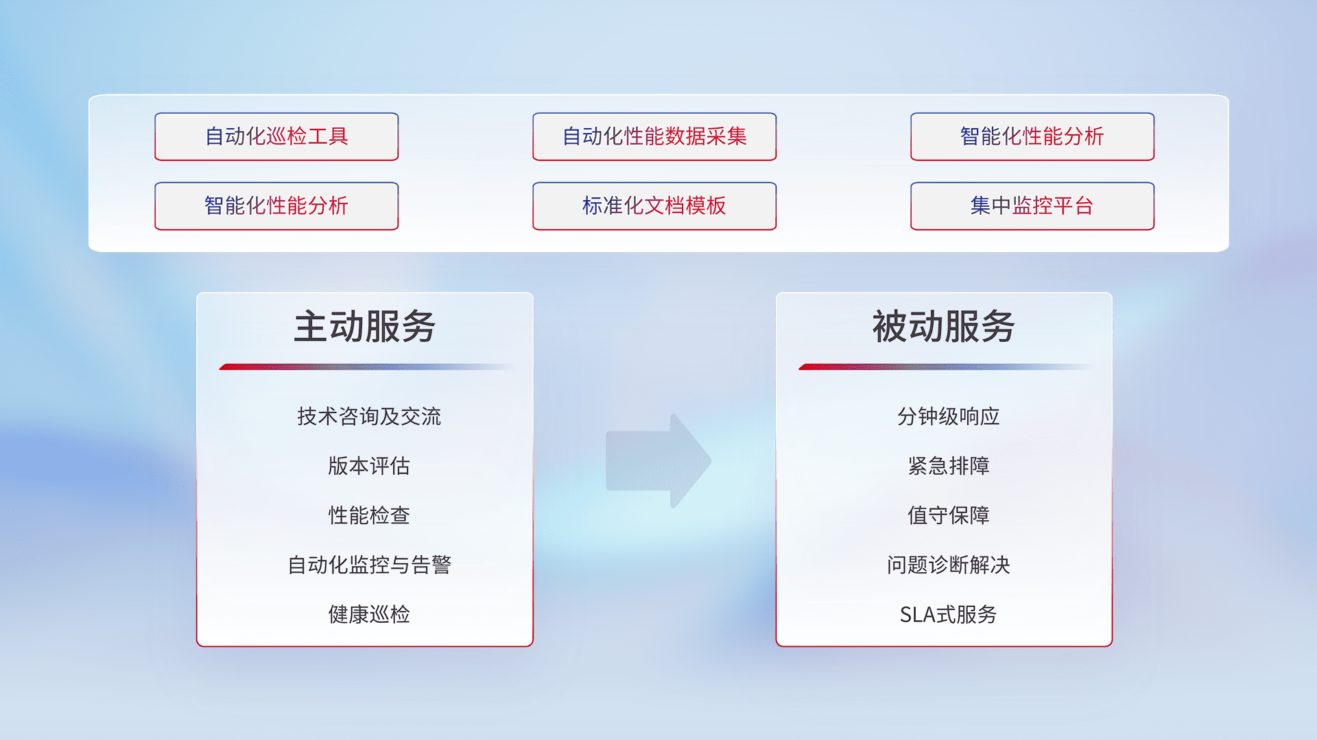 智能化工具和标准化文档,,,保障服务质量,,,提供主动服务(包含技术咨询、、、版本评估、、、性能检查、、自动化监控与告警、、健康巡检)和被动服务包含(分钟级响应、、紧急排障、、、值守保障、、、问题诊断解决、、、、SLA服务)。。